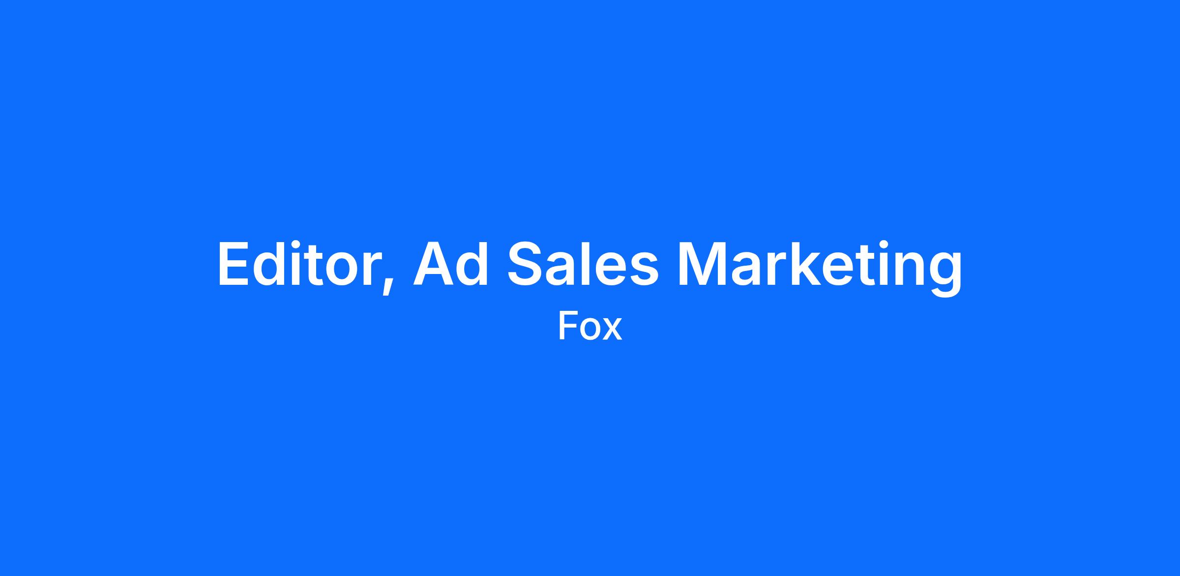 Fox CorporationUnder the FOX banner, we produce and distribute content through some of the worldβs leading and most valued brands, including: FOX News Media, FOX Sports, FOX Entertainment, FOX Television Stations and Tubi Media Group. We empower a diverse range of creators to imagine and develop culturally significant content, while building an organization that thrives on creative ideas, operational expertise and strategic thinking.We are seeking a Creative Marketing Editor to join our Ad Sales team and play a key role in shaping compelling, client-facing marketing content. This role sits at the intersection of editorial storytelling, brand strategy, and revenue, translating advertising solutions into clear, engaging narratives that resonate with clients and partners.